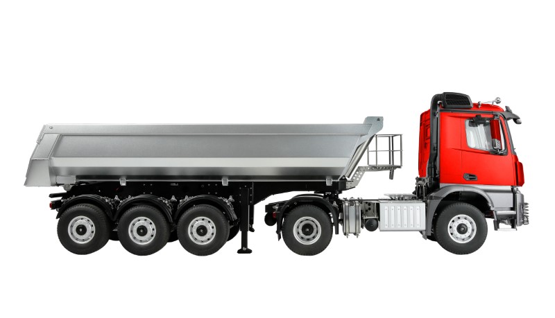 Dieser lizenzierte Lkw aus der Mercedes-Benz Arocs-Serie überzeugt als 4x4-Sattelzugmaschine mit Kippauflieger mit einer elektronisch betriebenen Kippfunktion über ein Schneckengetriebe.