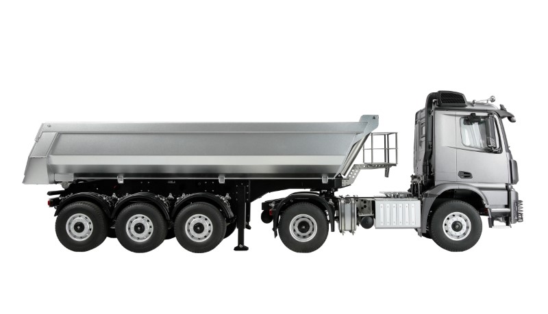 Dieser lizenzierte Lkw aus der Mercedes-Benz Arocs-Serie überzeugt als 4x4-Sattelzugmaschine mit Kippauflieger mit einer elektronisch betriebenen Kippfunktion über ein Schneckengetriebe.