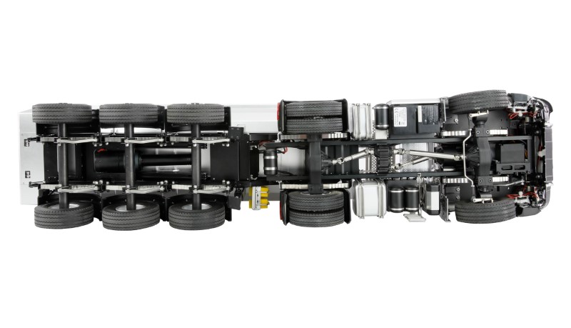Für die Zugmaschine ist im Lieferumfang ein 7,4V Li-Ion-Akku mit 5000mAh Kapazität enthalten, der je nach Einsatz und Fahrweise Fahrzeiten zwischen 40 und 60 Minuten ermöglicht. Die Höchstgeschwindigkeit beträgt etwa 3-4 Stundenkilometer. Die mitgelieferte 2,4GHz Fernsteuerung mit acht Kanälen verfügt über eine Reichweite von mehr als 100 Metern und bietet alle nötigen Funktionen. Alle Schalter, Mischer und Steuerbefehle sind werkseitig programmiert und einsatzbereit. Für die Beleuchtung und den Spindelantrieb ist für den Auflieger ein zusätzlicher Akku mit 3000mAh im Lieferumfang enthalten.