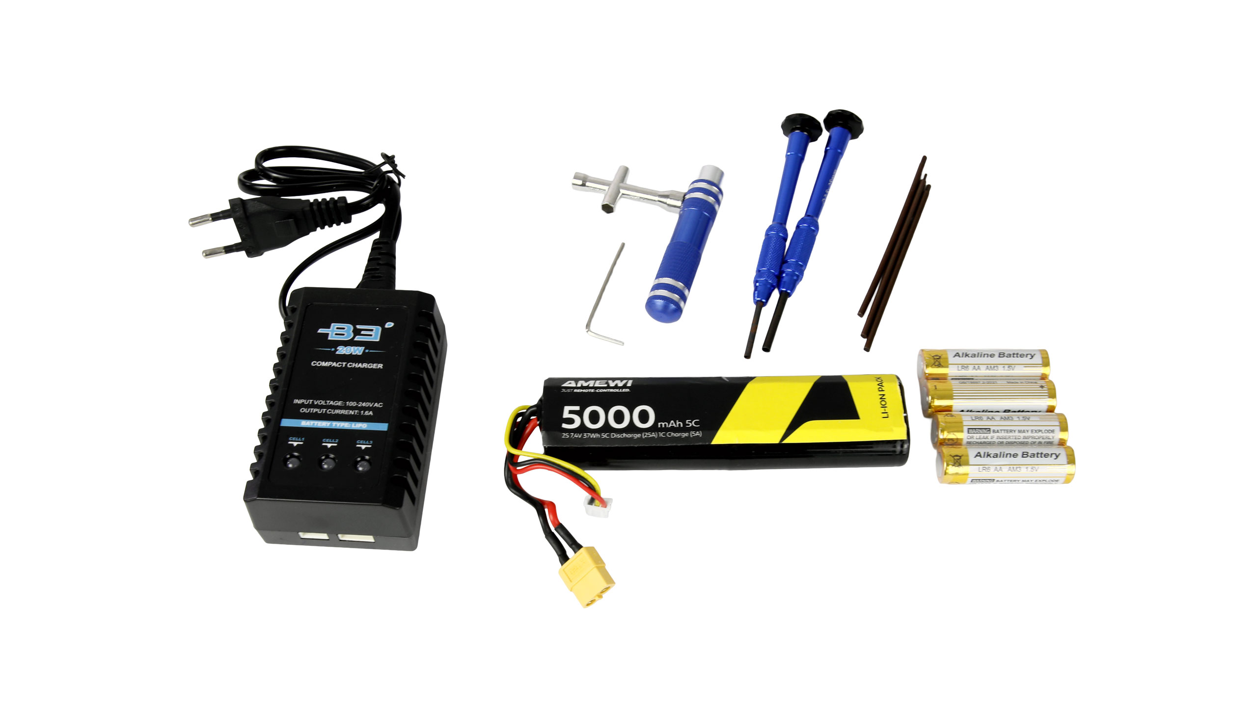 - RTR-Set (Ready-to-Run) inkl. Fernsteuerung, Akku, Ladekabel