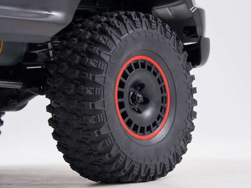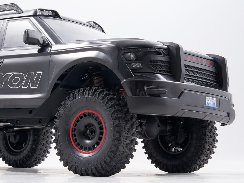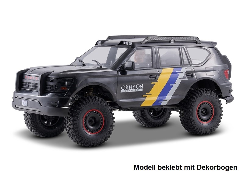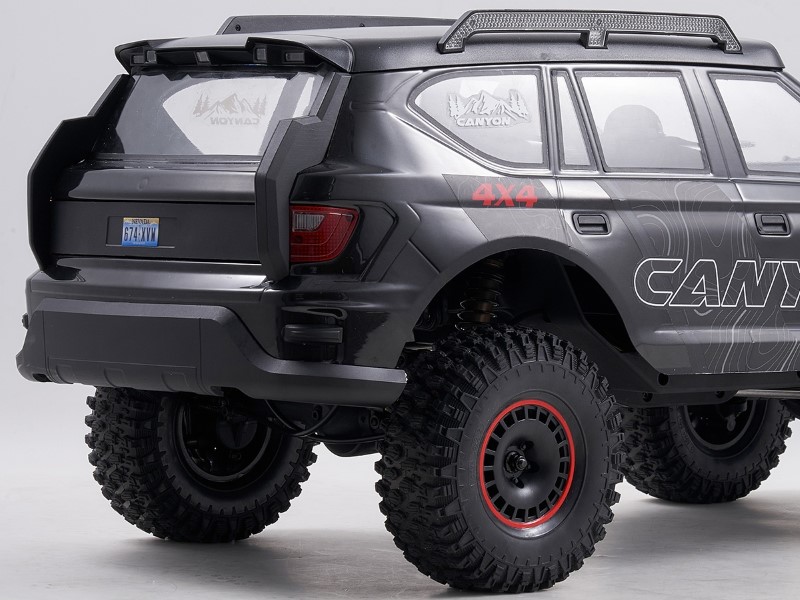 Für technische Trails gemacht Der Antrieb erfolgt über eine kräftige 550er Brushed-Motor (32T) Einheit. Zwei per Fernsteuerung schaltbare Gänge sorgen für eine ausgewogene Kombination aus Drehmoment (Low Gear) und Geschwindigkeit (High Gear). Zusätzlich verfügt der Canyon über ein mittiges Verteilergetriebe mit Rückwärtsgang - sehr selten in dieser Fahrzeugklasse. Für maximale Geländegängigkeit ist der Canyon mit einem DIG-System ausgestattet: Hierbei kann eine Hinterachse blockiert werden, um besonders enge Wendemanöver (ähnlich wie bei Kettenfahrzeugen) auszuführen - ideal auf technischer Strecke. Ein weiteres Feature ist der per Fernsteuerung sperrbare Vorder- und Hinterachsdifferentiale, was den Canyon besonders vielseitig macht - ob als Trailtruck oder als Competition-Crawler.