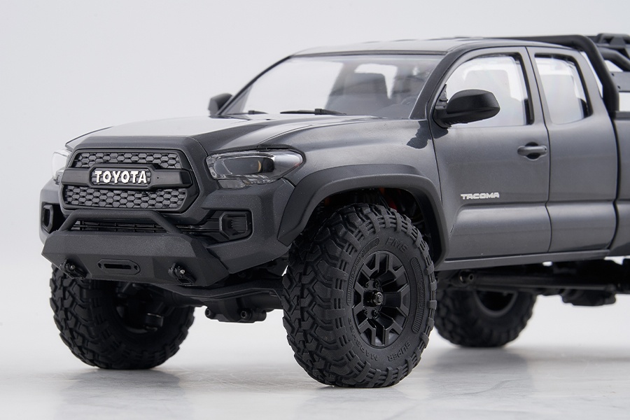 Die robuste ABS-Hartplastik-Karosserie wurde per Präzisionsspritzguss gefertigt und bildet alle markanten Details des Tacoma originalgetreu nach: Kühlergrill, Radläufe, Stoßfänger, Türgriffe, Scheibenwischer, Rückspiegel und sogar die Heckklappe wurden originalgetreu nachgebildet. Ab Werk ist der Tacoma in drei typischen Farben des Originals erhältlich: Grau, Rot und Blau - so bleibt der Scale-Look auch in 1:24 authentisch.
