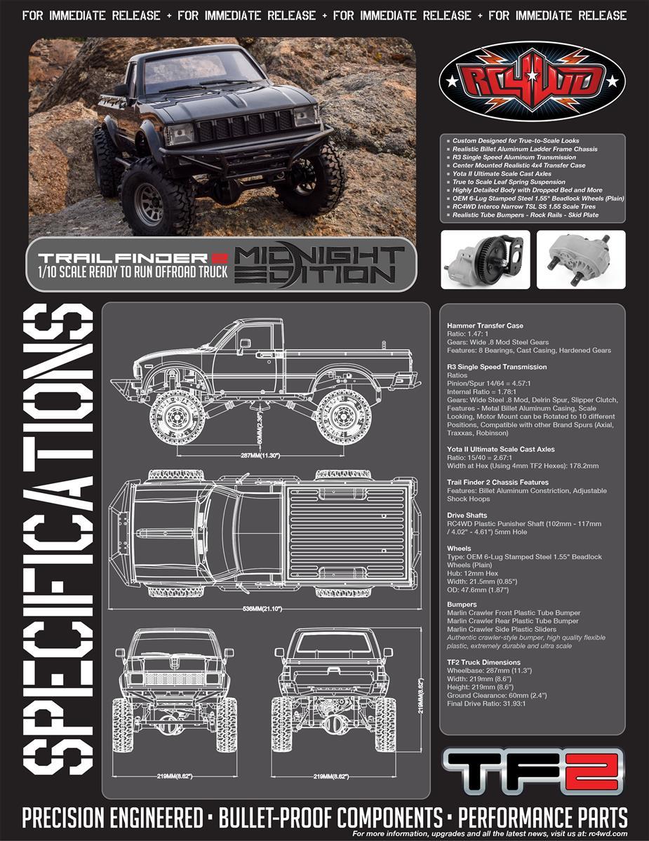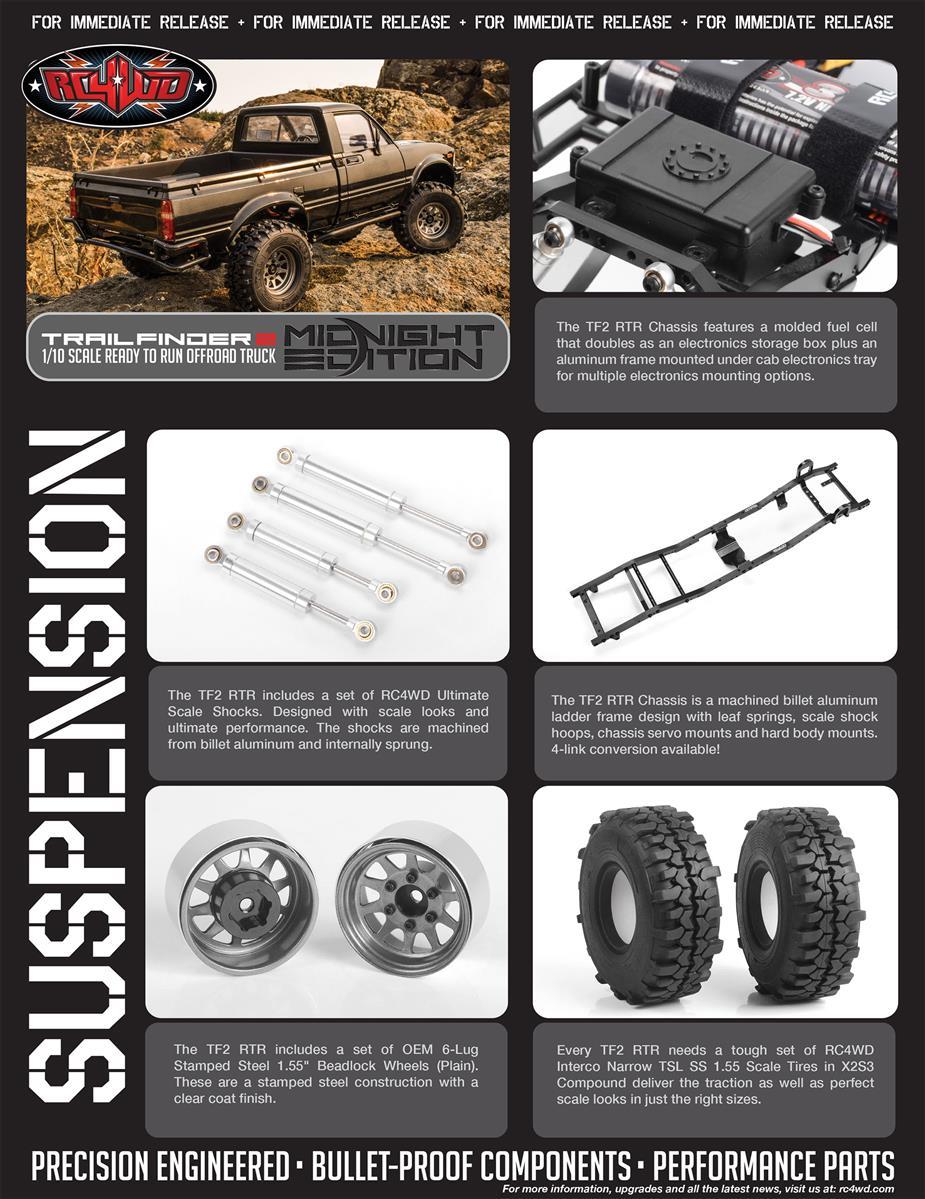 Der Publikumsliebling TF2 RTR ist zurück, in schwarz mit der Midnight Edition RTR. Nehmen Sie Trails mit Stil, mit den geschwärzten Details und den bulligen Interco Narrow TSL SS 1.55 Reifen die auf dem gun-metal Finish der OEM 6-Lug Stamped Steel 1.55 "Beadlock Räder montiert sind.