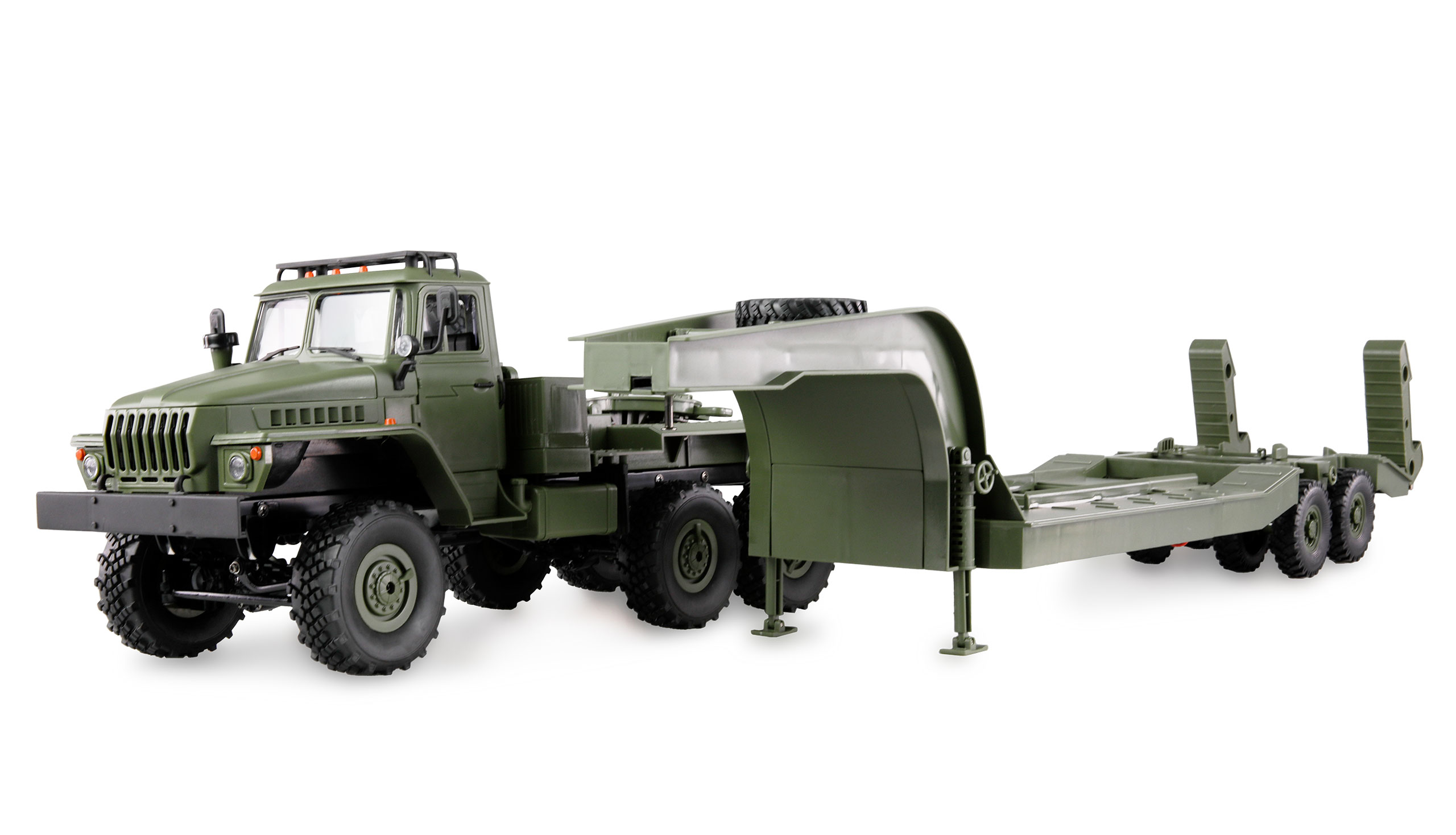 Dieser Scale-Nachbau des historischen Ural Militärtransporters im Maßstab 1:16 bietet dank seines 6WD-Antriebs eine optimale Kraftverteilung und eignet sich damit hervorragend für spannende Fahrten im Gelände. Selbst schwere Lasten wie Truppenpanzer oder ähnliche Modelle dieser Größe können problemlos transportiert werden. Ein 280er Brushed-Motor und ein mehrfach untersetztes Getriebe sorgen für die nötige Leistung. Das Modell ist mit einem elektronischen Abrollschutz (Mountainbreak) ausgestattet, der für sicheren Halt und präzise Steuerung im schwierigen Terrain sorgt. Die High-Grip-Gummibereifung auf allen Achsen und teleskopische Antriebswellen ermöglichen eine maximale Achsverschränkung ohne Verlust der Antriebskraft. Blattfedern wie beim Original und ein störungssicheres 2,4GHz-System vervollständigen die Ausstattung.