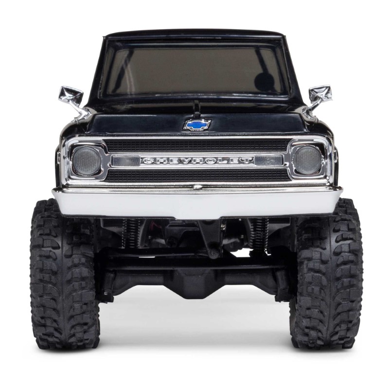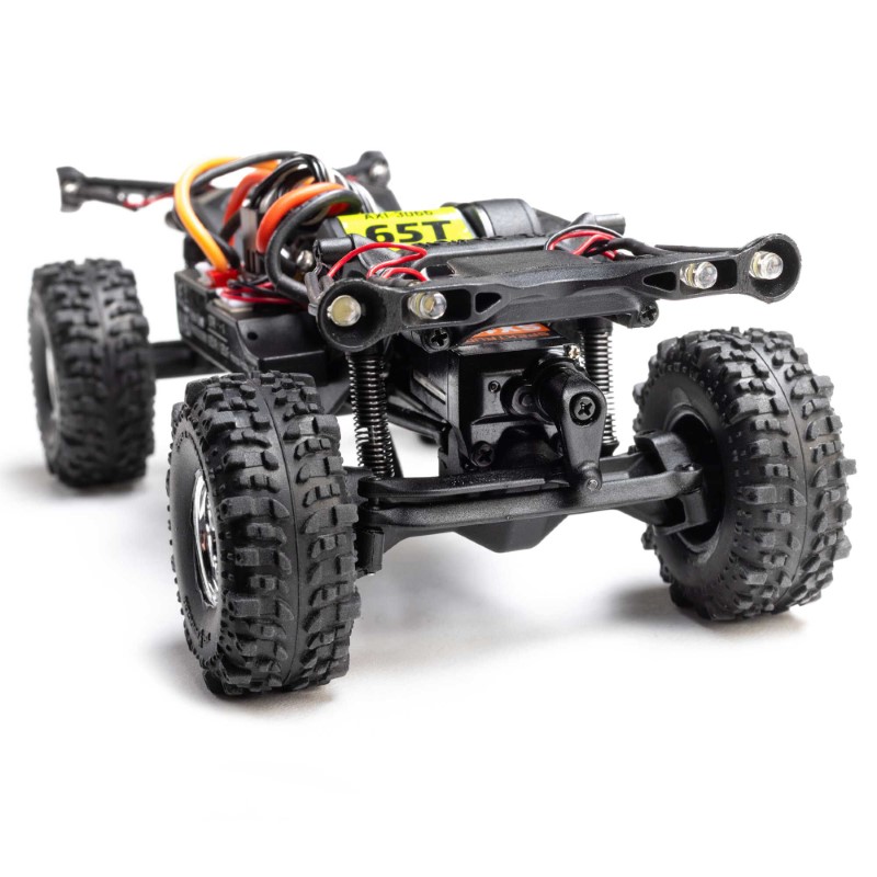 Der Chevy K10 ist mit einem angewinkelten Unterfahrschutz ausgestattet, der es ermöglicht, mühelos über schwierige Hindernisse zu gleiten – ein Feature, das normalerweise nur bei Wettbewerbs-Crawlern zu finden ist. Abgeschrägte Achsgehäuse und hochgelegte Links verhindern zusätzlich ein Hängenbleiben. Die Kletterstabilität auf Felsen wird durch die nach vorne verlagerte Gewichtsverteilung des Chassis verbessert. Weitere Leistungsmerkmale sind gedämpfte 25-mm-Stoßdämpfer, ein kugelgelagertes Set, ein kraftvoller Axial 65T-Motor und zuverlässige Spektrum-Elektronik, die tief im Chassis montiert ist, um den Schwerpunkt zu optimieren.