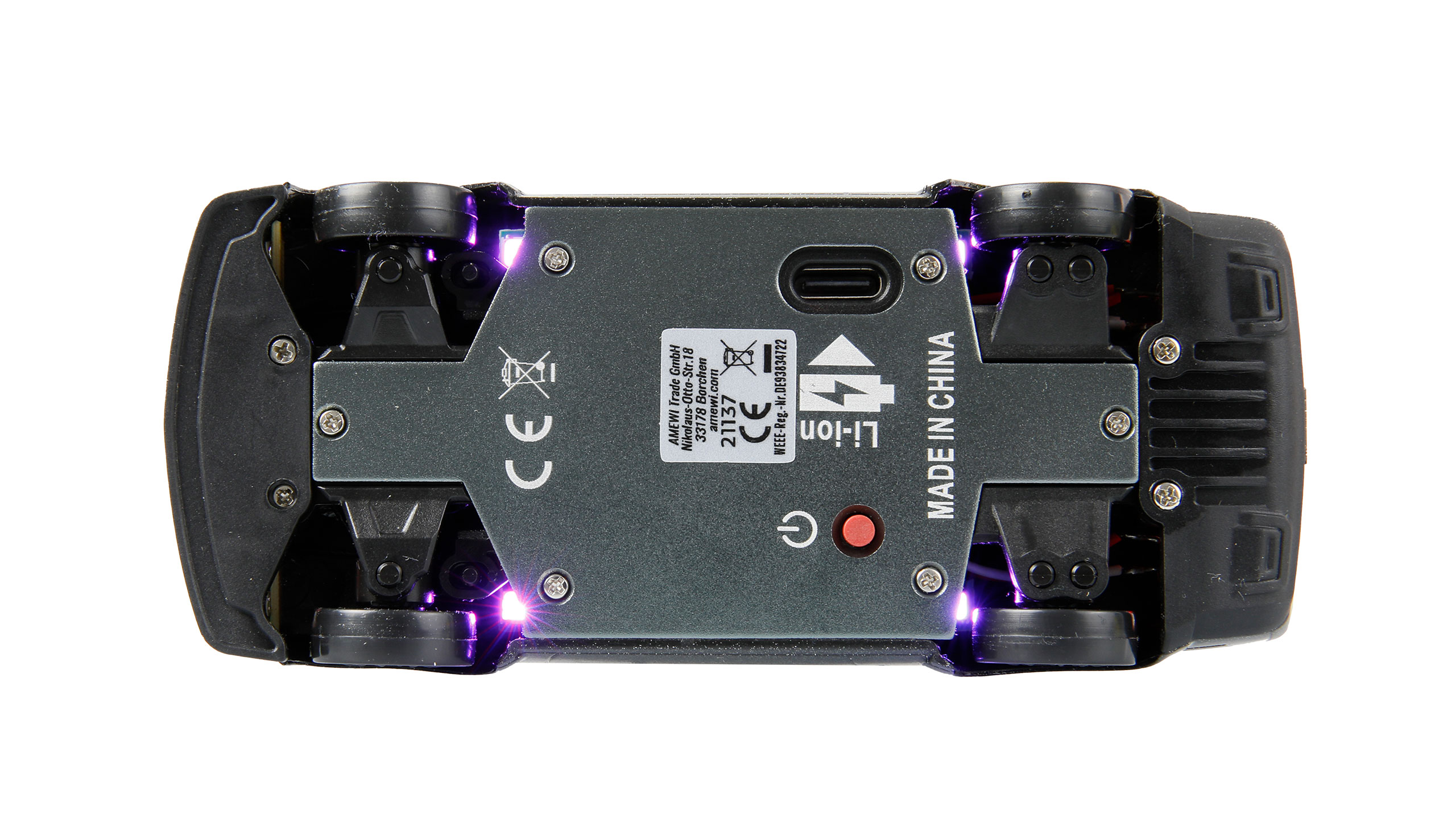 Das Modell erreicht Geschwindigkeiten von bis zu 15 km/h und bietet dank des integrierten LiPo-Akkus Fahrzeiten von rund 20 Minuten. Eine Unterspannungswarnung schützt den Akku zuverlässig vor Tiefentladung. Der Akku lässt sich über die eingebaute USB-C-Ladebuchse in etwa 30 Minuten wieder aufladen. Ein passendes USB-Ladekabel ist im Lieferumfang enthalten.