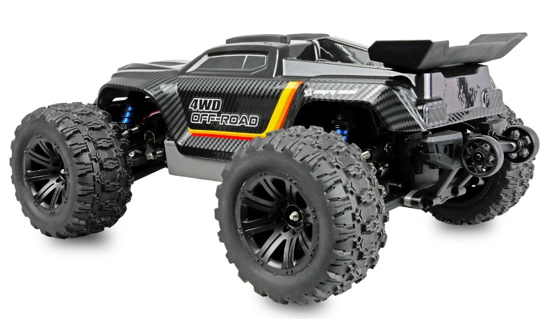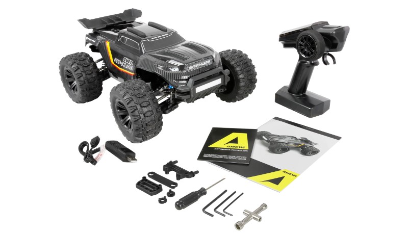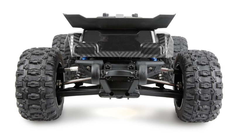 Das RTR-Set wird vollständig fahrfertig geliefert und beinhaltet Fernsteuerung, Akku und Ladekabel. Eine wassergeschützte Empfängerbox ermöglicht den Einsatz bei nahezu allen Wetterbedingungen, während die griffige Gummibereifung und die Metall-CVD-Antriebswellen vorne und hinten für maximale Traktion und Belastbarkeit sorgen. Das Chassis ist in einer leichten, stabilen Wabenstruktur ausgeführt und durch eine massive Metall-Strebe zusätzlich versteift, was die Verwindungssteifigkeit deutlich erhöht.