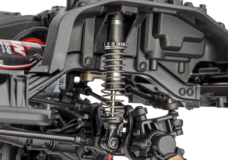 Kabelführungen im Inneren des Fahrzeuges sorgen für saubere Verkabelung und eine ordentliche Optik. Die ölgefüllten GTS Aluminium Stoßdämpfer wurden eigens für den TRX-4 entwickelt. Sie sorgen auch für sanftes Fahrverhalten unter rauesten Offroad-Bedingungen. Die Dual Fit Akkuhalterung garantiert ein einfaches Wechseln der Akkus ohne Splinte die im Gelände vielleicht verloren gehen könnten. Der aufklappbare Befestigungshebel ist durch Wenden auf zwei verschiedene Höhen einstellbar. Eine im Akkuschacht integrierte Mulde ermöglicht das Fixieren von kleineren Akkus.